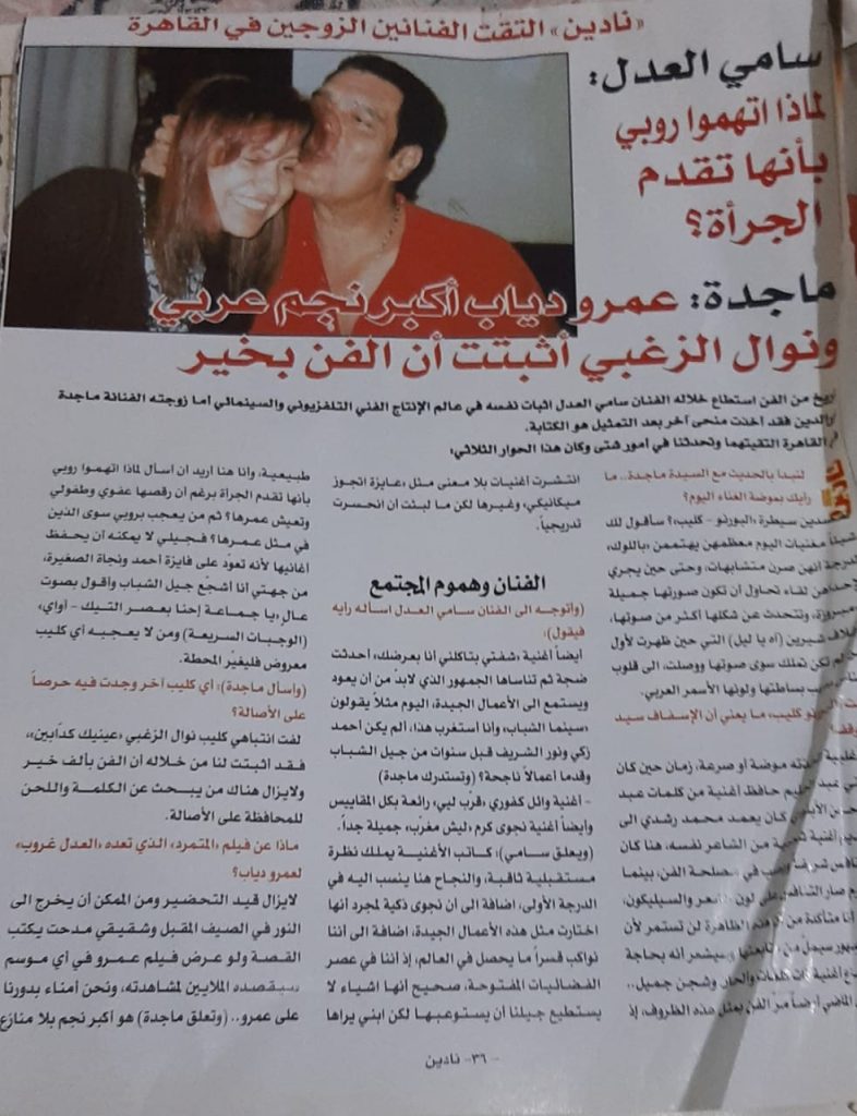 -(يقول سامي) لا يزال قيد التحضير ومن الممكن أن يخرج الفيلم الى النور الصيف المقبل، وشقيقي مدحت يكتب القصة، ولو عرض فيلم عمرودياب في أي موسم سيقصده الملايين لمشاهدته ونحن أُمناء بدورنا على عمرو..(وتعلق ماجدة) هو أكبر نجم بلا منازع على مستوى الوطن العربي.