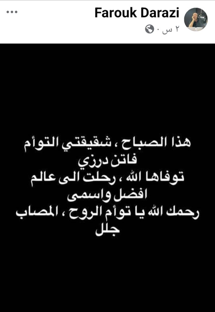 حيث نعاها شقيقها الاعلامي فاروق درزي عبر صفحته الرسمية على الفيسبوك حيث كتب :” هذا الصباح شقيقتي فاتن توفاها الله ، رحلت الى عالم افضل واسمى ، رحمك الله يا توأم الروح، المصاب جلل “..