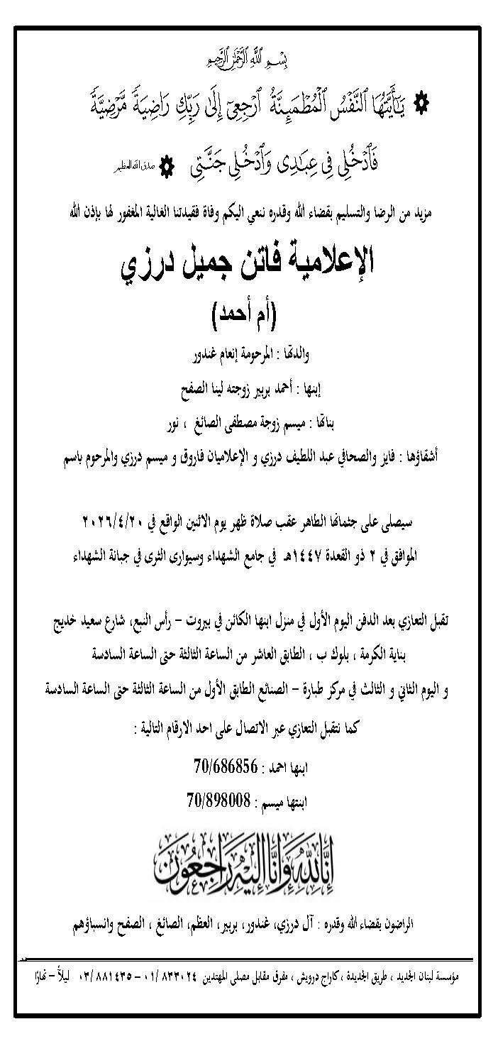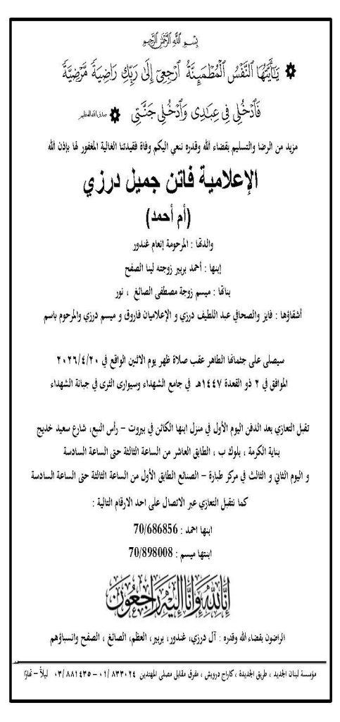 وكانت فاتن قد عانت قبل فترة من عدة وعكات صحية ، وقبل ايام تدهورت حالتها وتم نقلها الى الجامعة الاميركية حيث وافتها المنية هناك .. إنا لله وإنا إليه راجعون وخالص التعازي لآل درزي الكرام